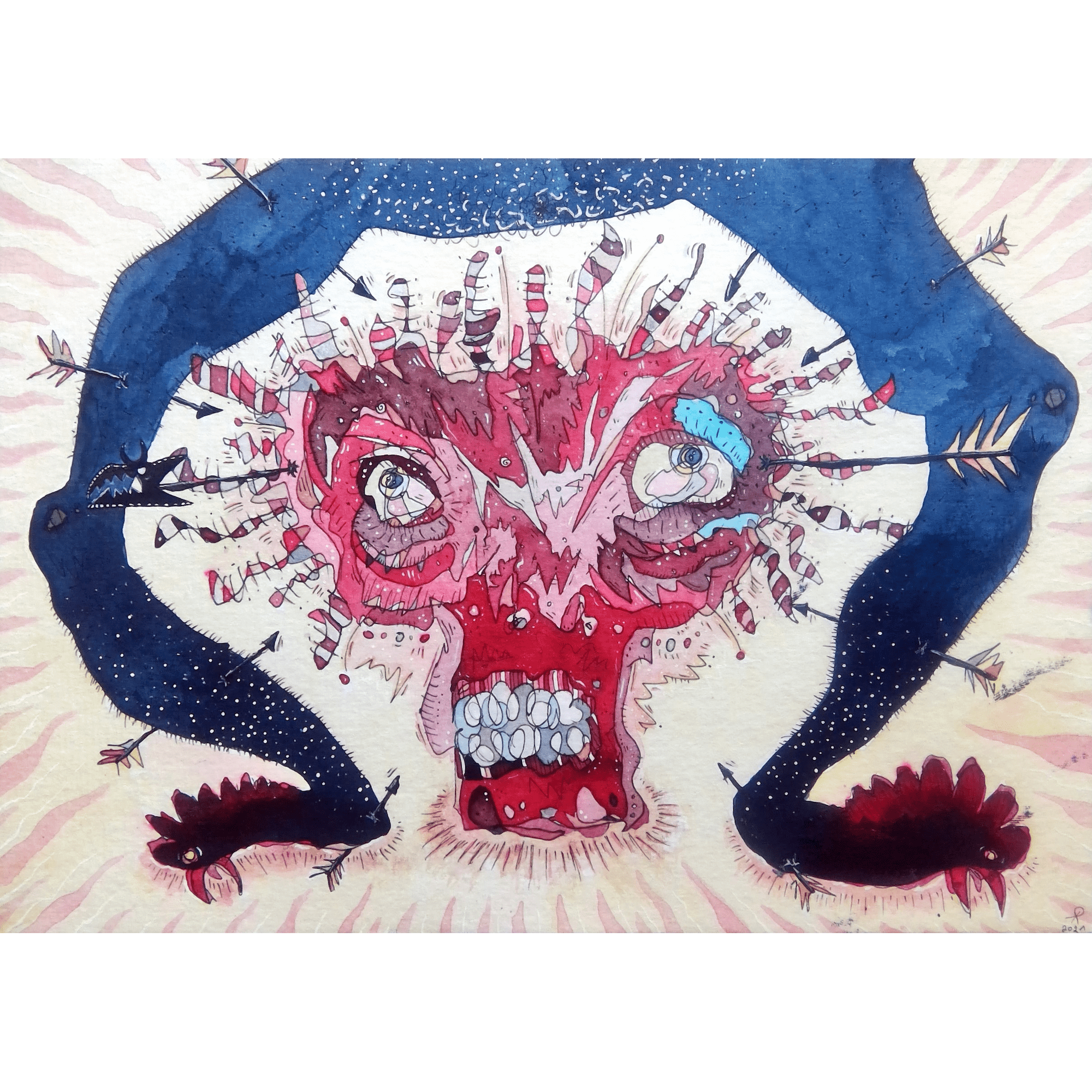 A raw and intensely expressive piece of Surreal Expressionism, Shattered Focus depicts a chaotic state of psychological distress and rupture. Its vibrant crimson and pink fragments are dramatically framed by deep indigo arrows, making it a powerful statement piece for any modern collection. Available as a premium art print in various materials and sizes, or as a high-resolution digital download.